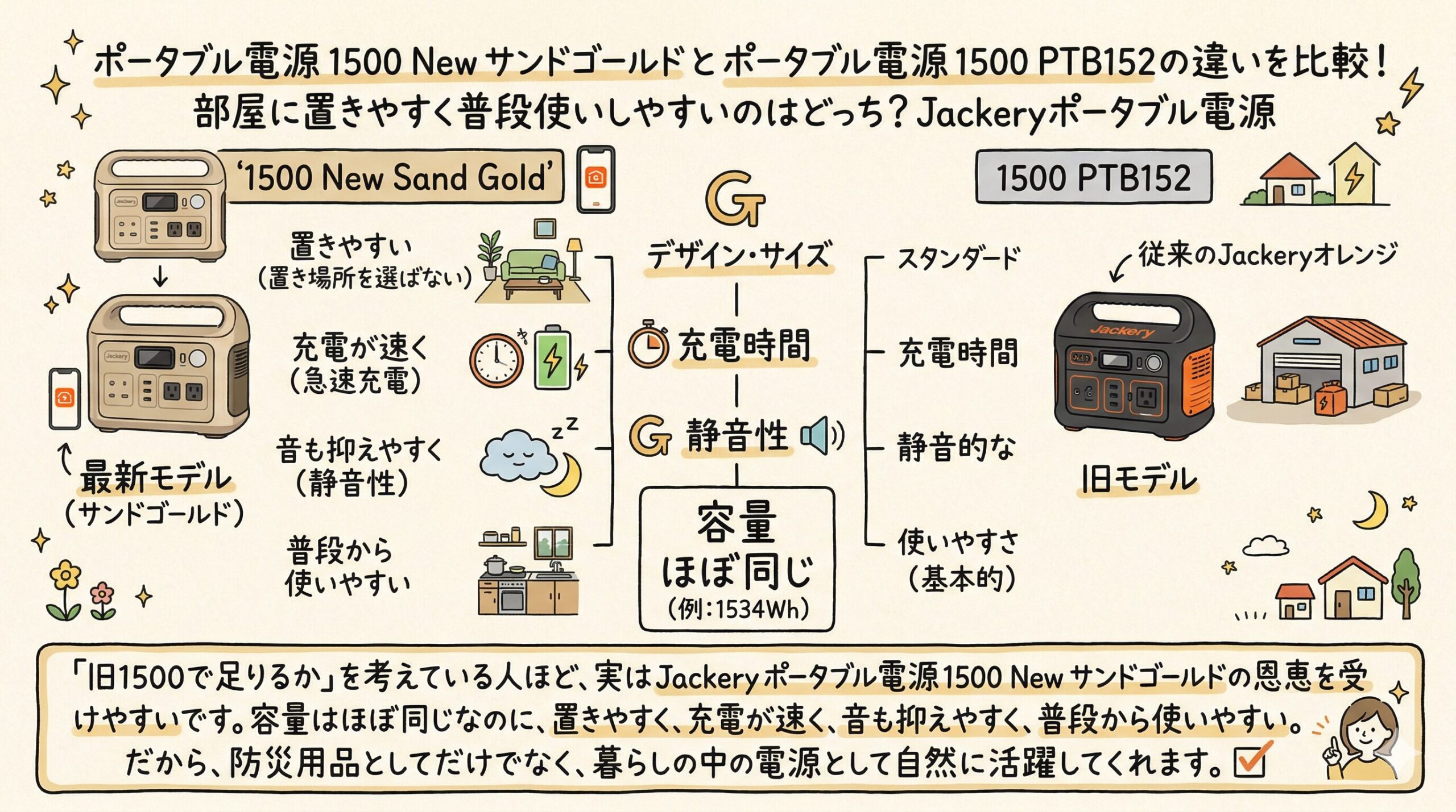 とくに、旧Jackery ポータブル電源 1500 PTB152を「非常時しか使っていない」「重くて出しっぱなしにしにくい」「充電が面倒」と感じているなら、Jackery ポータブル電源 1500 New サンドゴールドへの買い替え価値は高いです。