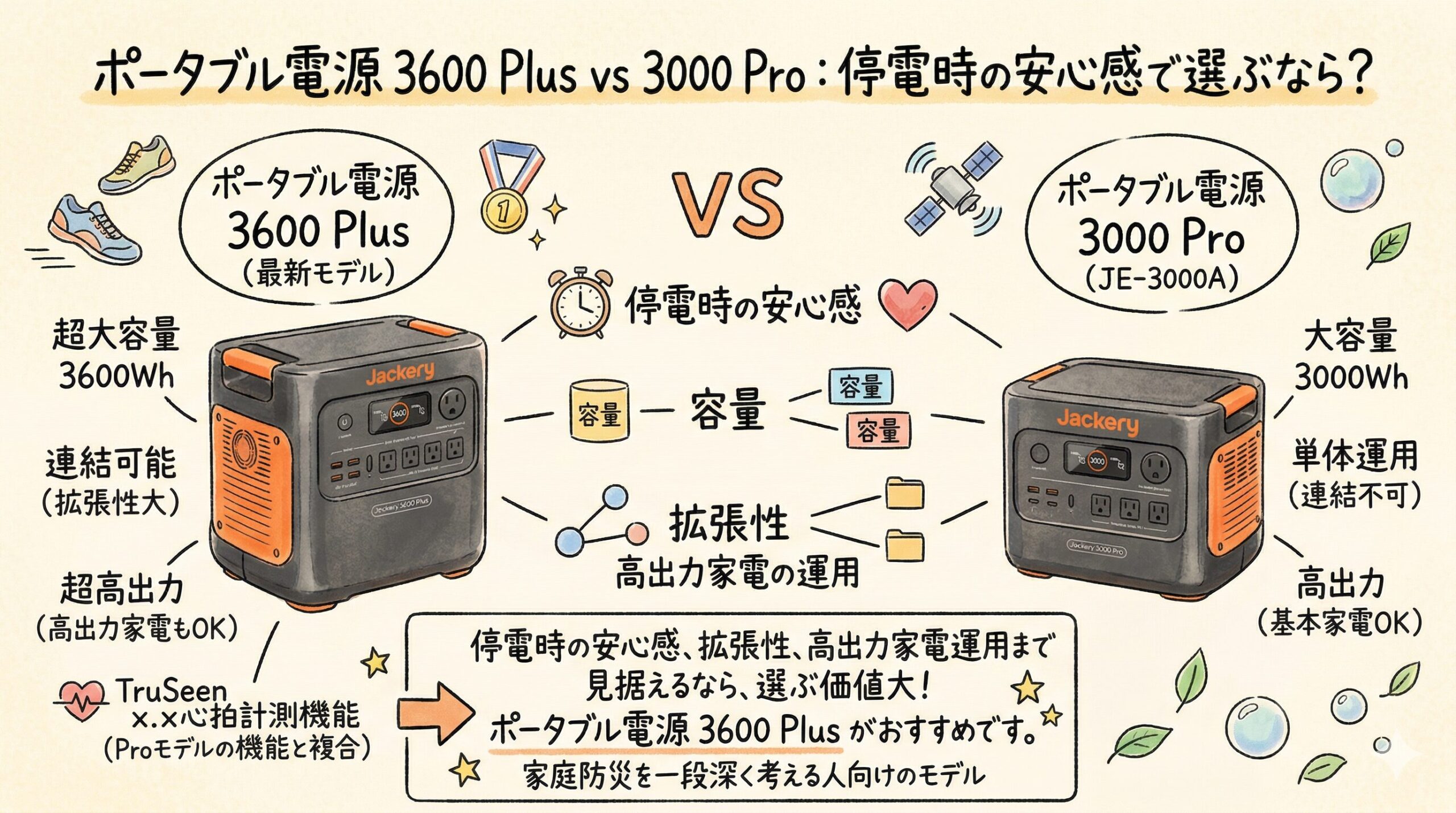 今回の比較で先に結論を言うと、家全体の安心感まで買いたいなら ポータブル電源 3600 Plus、価格と完成度のバランスを重視するなら ポータブル電源 3000 Pro JE-3000A です。