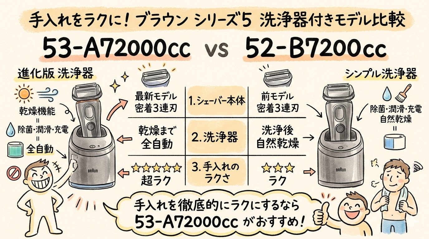 価格最優先なら52-B7200cc、手入れのラクさに加えて剃りやすさまで欲しいなら53-A72000CCです。