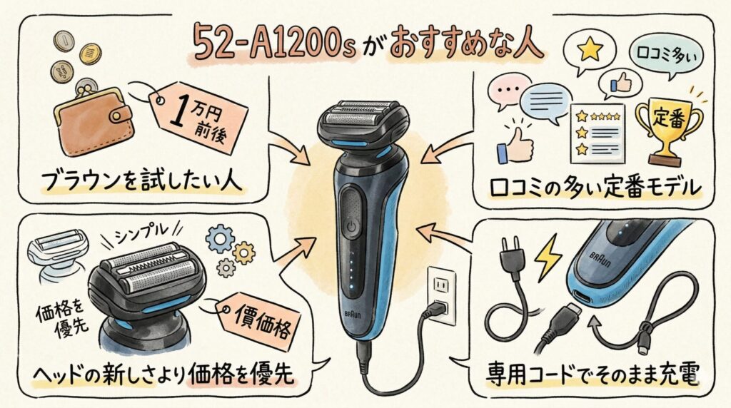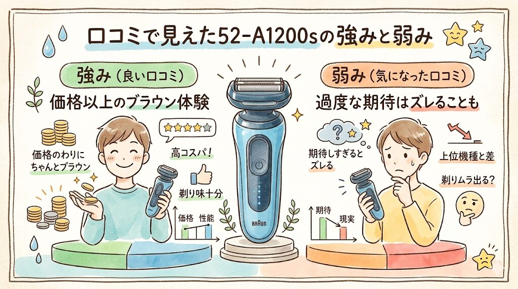 調査していて印象に残ったのは、52-A1200s を選んだ人の中に、軽さや使いやすさには満足しているのに、深剃りだけは期待ほどではなく、結局アゴ下を何度も往復してしまった というタイプの声があったことです。