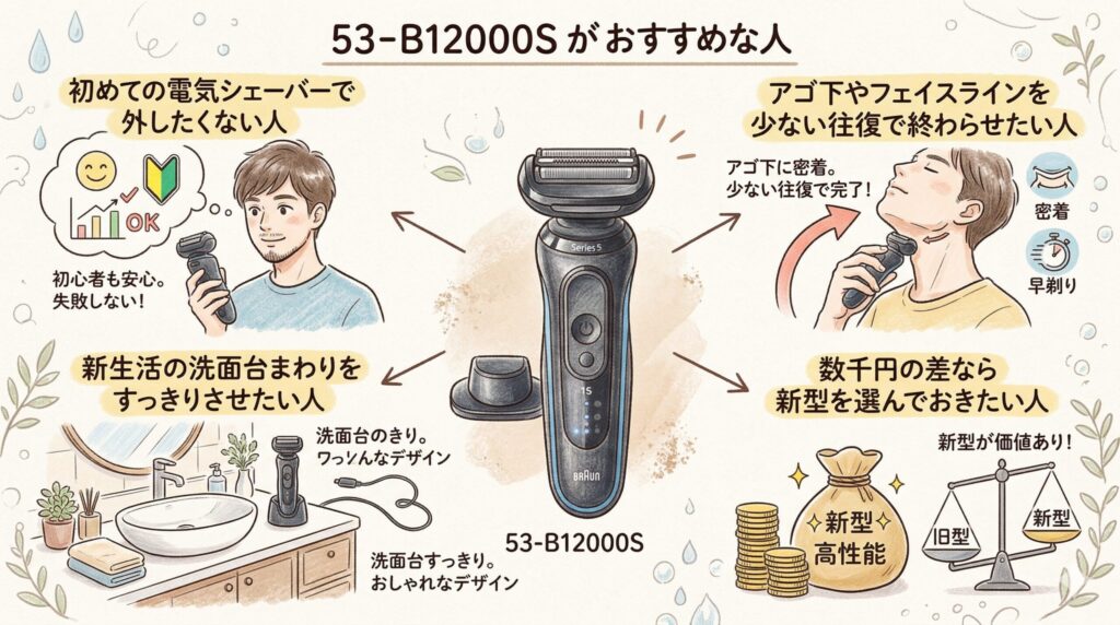 もしあなたが今いちばん解消したいのが、価格そのものよりも朝のひげ剃りのめんどくささなら、今回は 53-B12000S のほうが納得しやすいです。