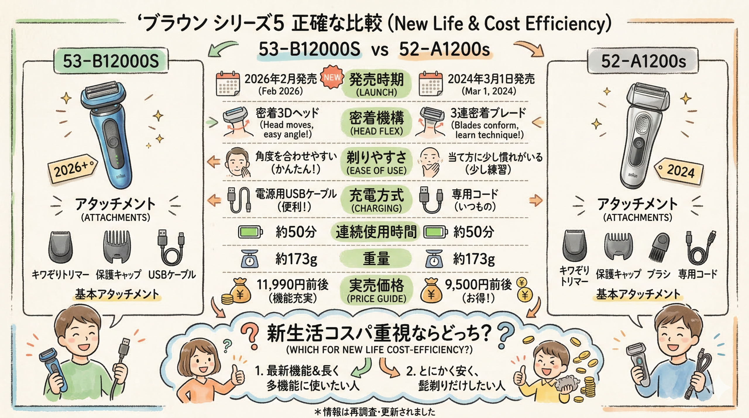 新生活で初めて電気シェーバーを買うとき、そんな悩みで止まりやすいのが 53-B12000S52-A1200s です。