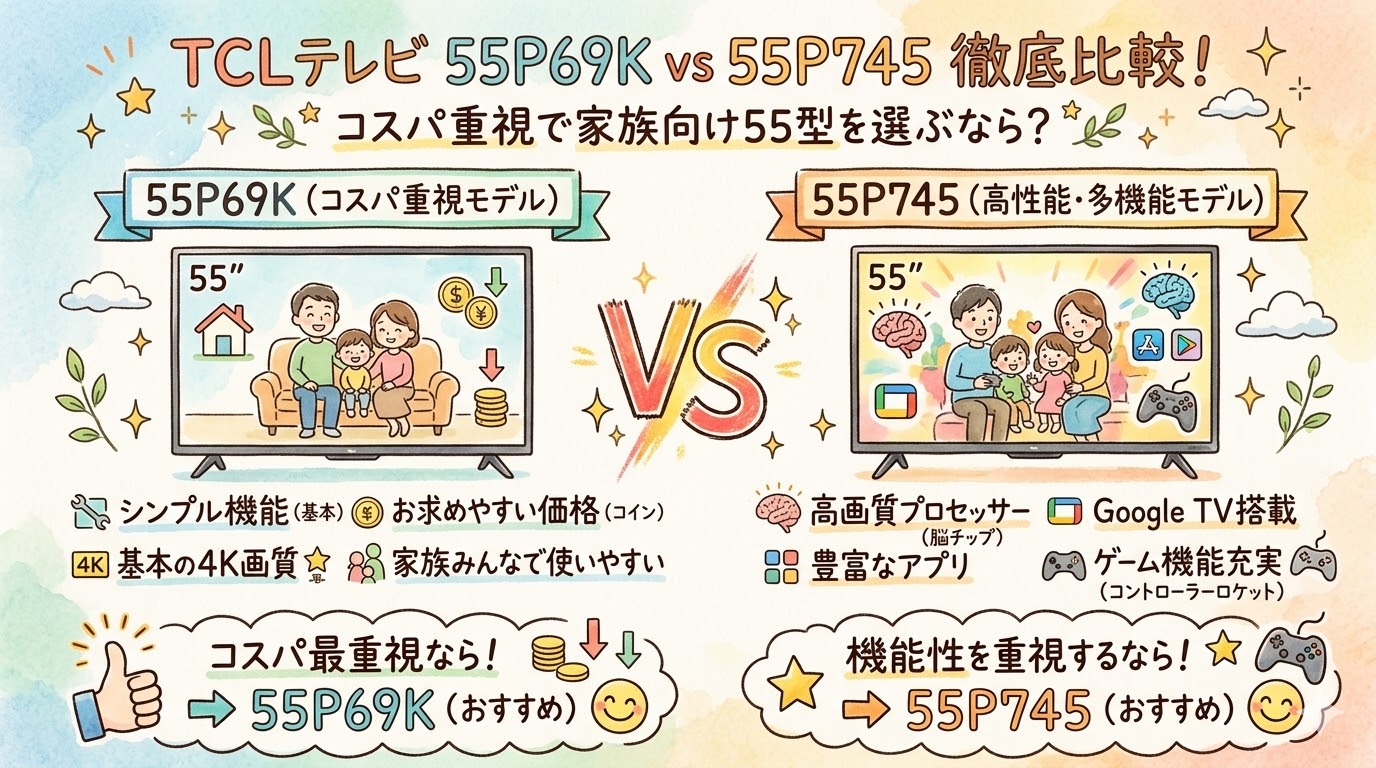 結論として、ゲームや映像の本格的な楽しみ方を重視するなら55P745、シンプルにコスパよく大画面を揃えたいなら55P69Kです。