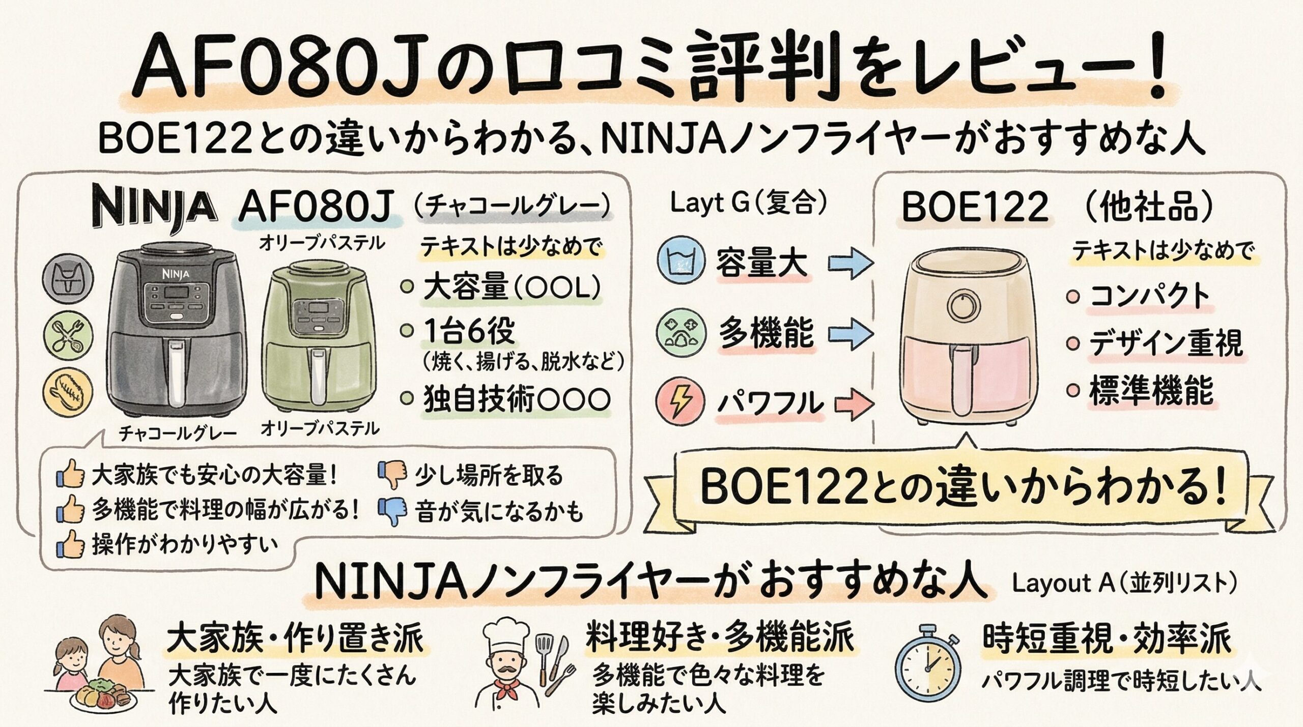 それでも私は、毎日使う現実まで考えるなら、まずは NINJA ミニエアフライヤー AF080J から見るのがおすすめです。