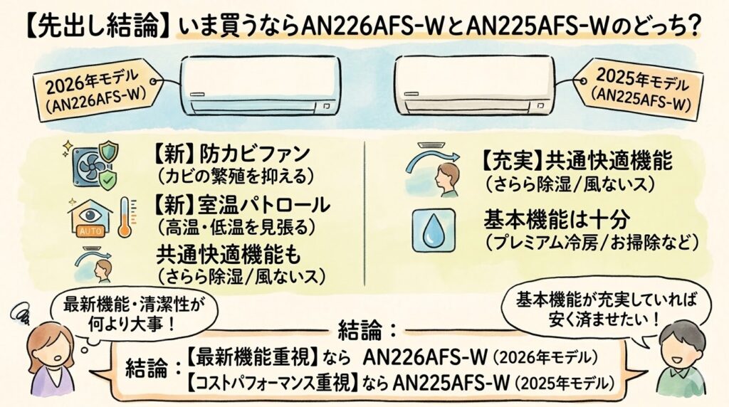 快適性に投資したいなら、Fシリーズは正解。 費用対効果を重視するなら、現時点では AN225AFS-W がかなり強い。 それでも最新年式の安心感がほしいなら AN226AFS-W を選べばいい。