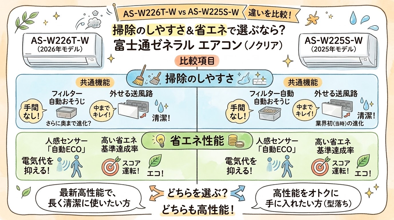 AS-W226T-WとAS-W225S-Wの違いを比較すると、2026年3月14日時点では掃除のしやすさ、省エネ性能、除湿の使い勝手の核心部分はかなり近いです。