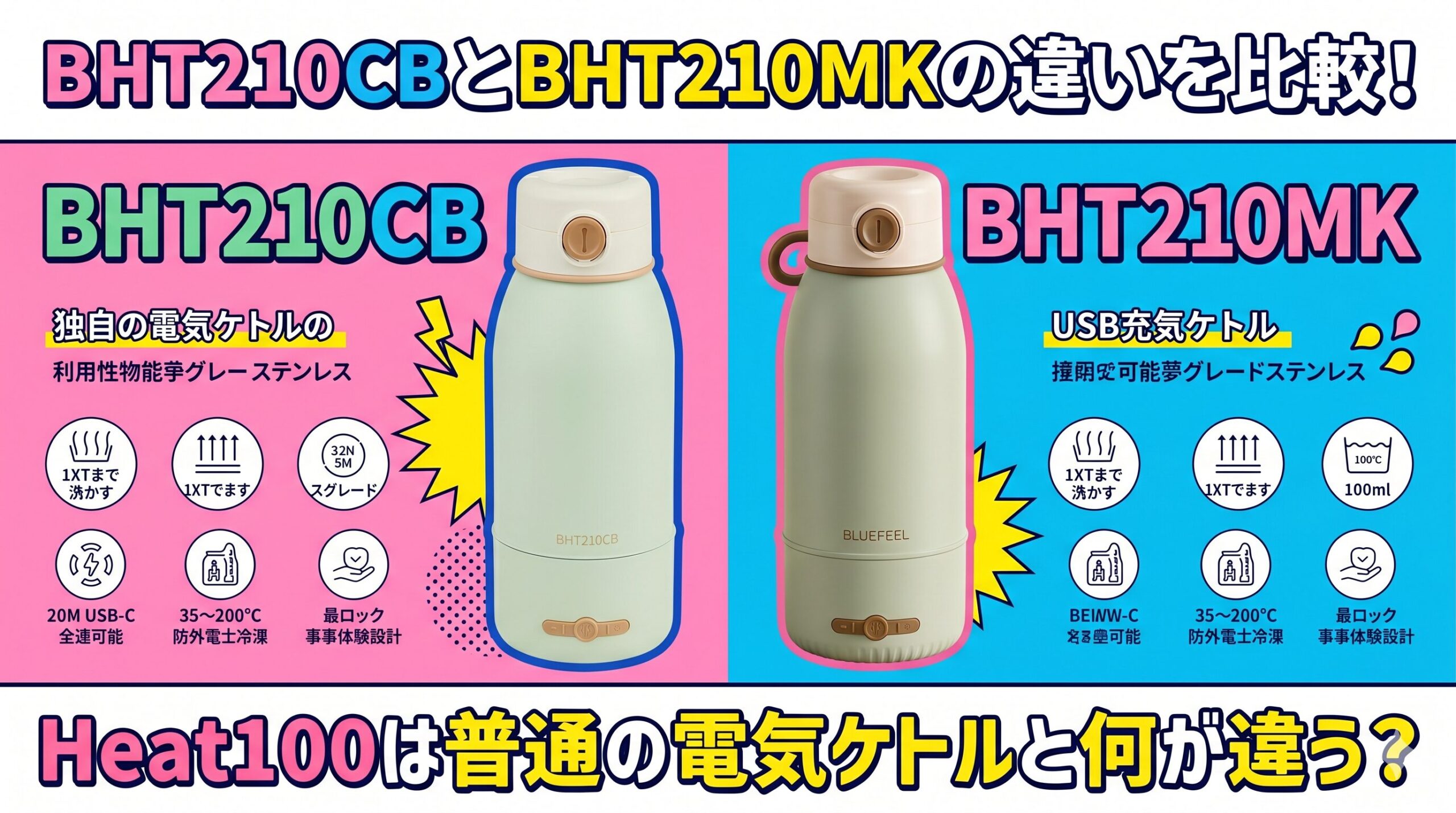 この記事では、BHT210CBとBHT210MKの違いを整理したうえで、Heat100と従来型ケトルの違いまでまとめて分かりやすく見ていきます。