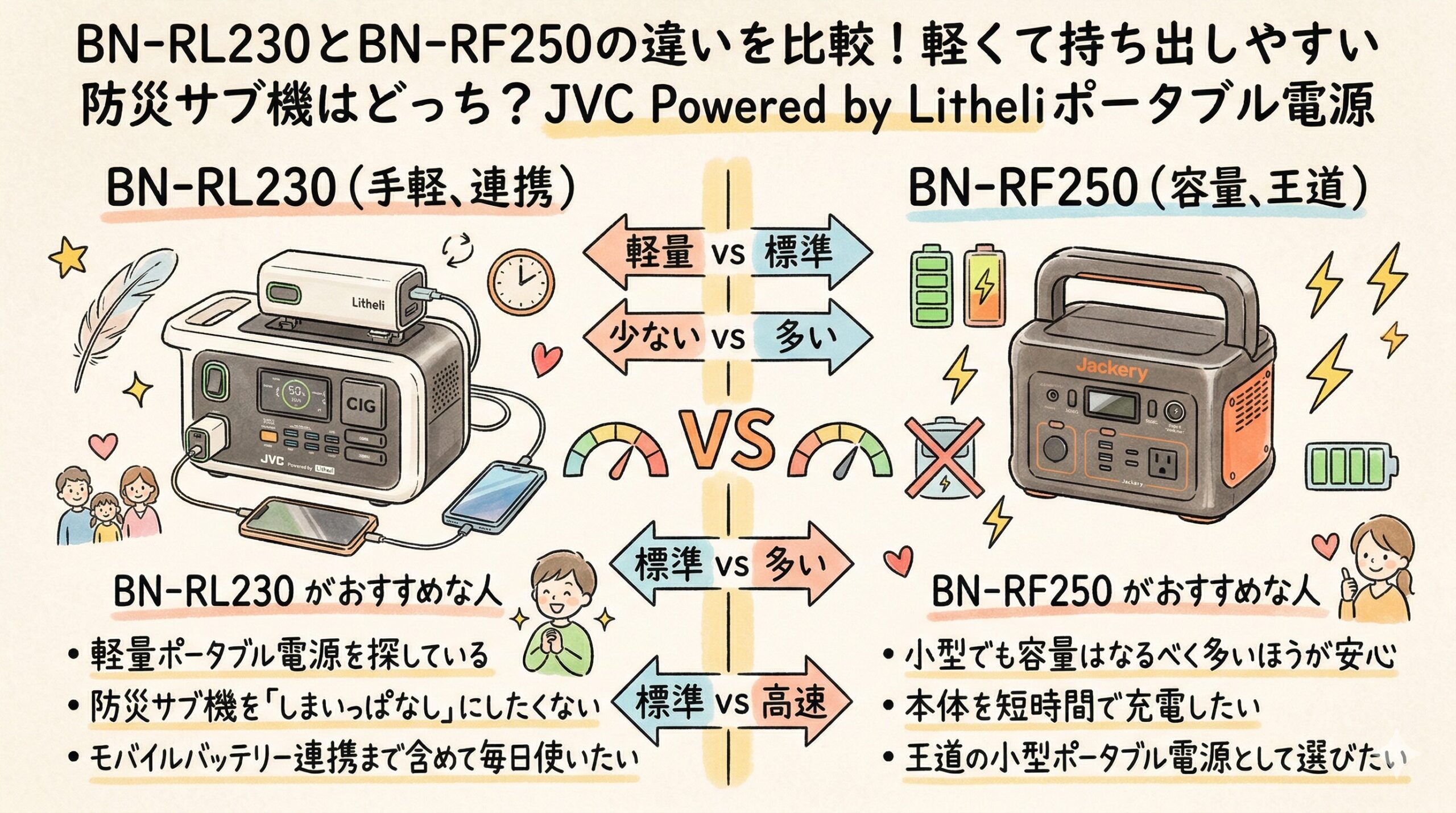 この記事では、公式情報や販売情報をもとに、BN-RL230とBN-RF250の違いを「持ち出しやすさ」「毎日使いやすさ」「一人分の停電対策」という視点で整理していきます。