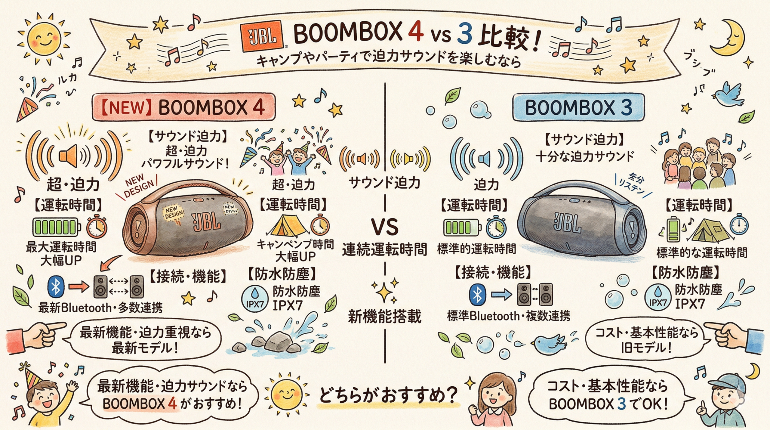 先に結論をいうと、いま新しく選ぶなら基本はBOOMBOX 4がおすすめです。