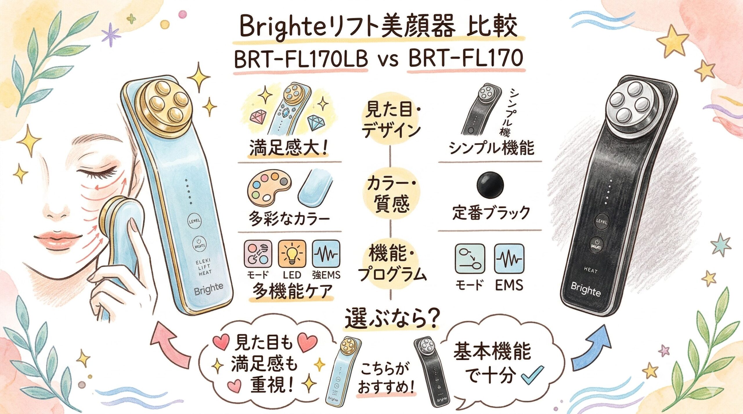 BRT-FL170LBとBRT-FL170は、性能差の大きい別機種というより、同じBrighteのリフト美顔器をどんな気分で使いたいかで選ぶ比較と考えるほうが自然です。