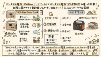 ポータブル電源 ポータブル電源 1500 New サンドゴールドとポータブル電源 1500 PTB152の違いを比較!部屋に置きやすく普段使いしやすいのはどっち?Jackeryポータブル電源