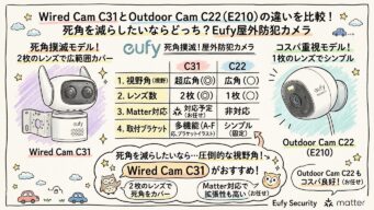 Wired Cam C31とOutdoor Cam C22(E210)の違いを比較!死角を減らしたいならどっち?Eufy屋外防犯カメラ