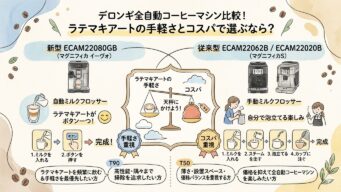 コーヒーメーカー ECAM22080GBとECAM22062B/ECAM22020Bの違いを比較!ラテマキアートの手軽さとコスパで選ぶなら?デロンギ全自動コーヒーマシン