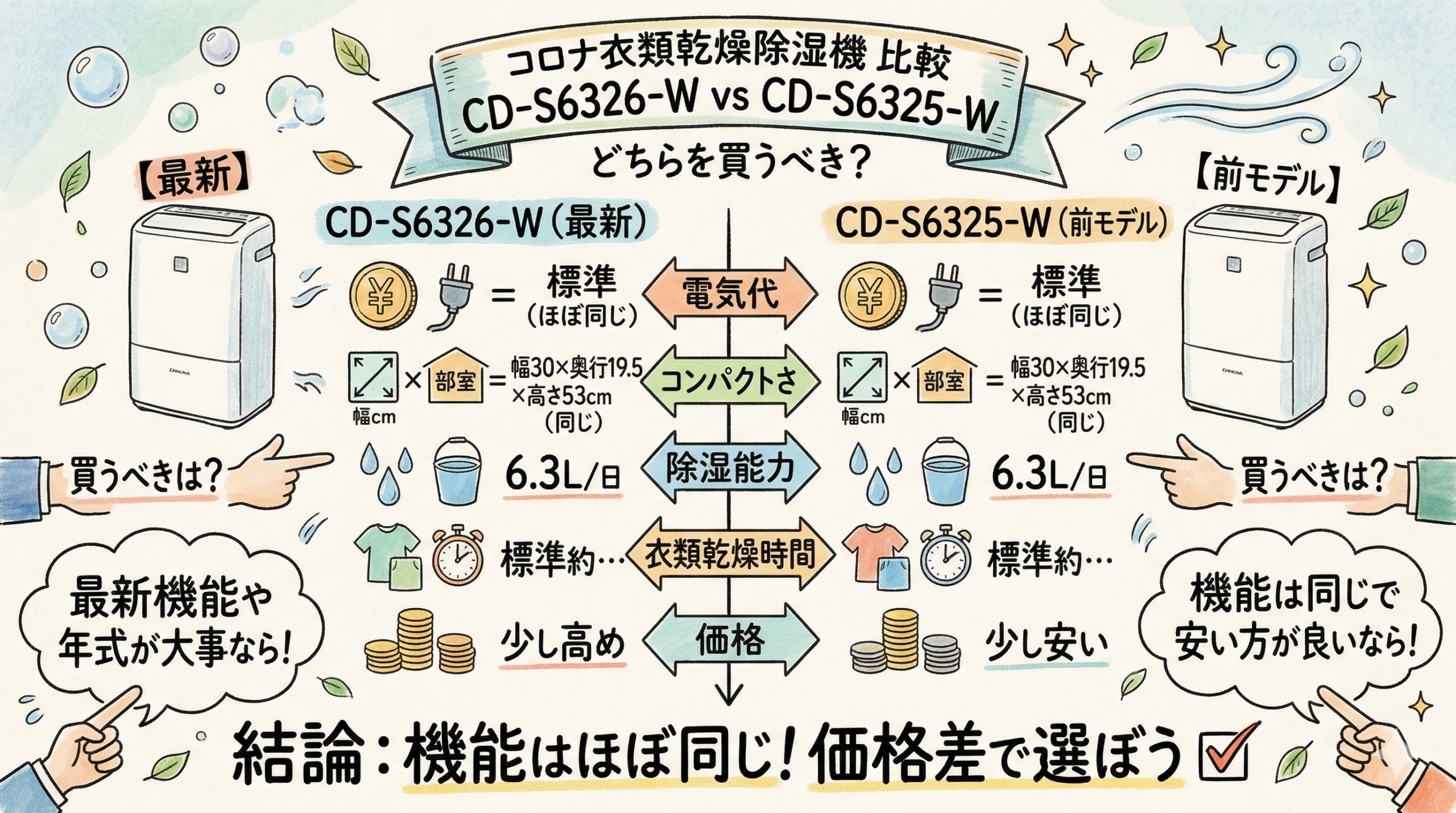 先に結論をいうと、価格差が5,000円以上あるなら CD-S6325-W、価格差が小さいか旧型の在庫切れが心配なら CD-S6326-W を選ぶのが失敗しにくいです。