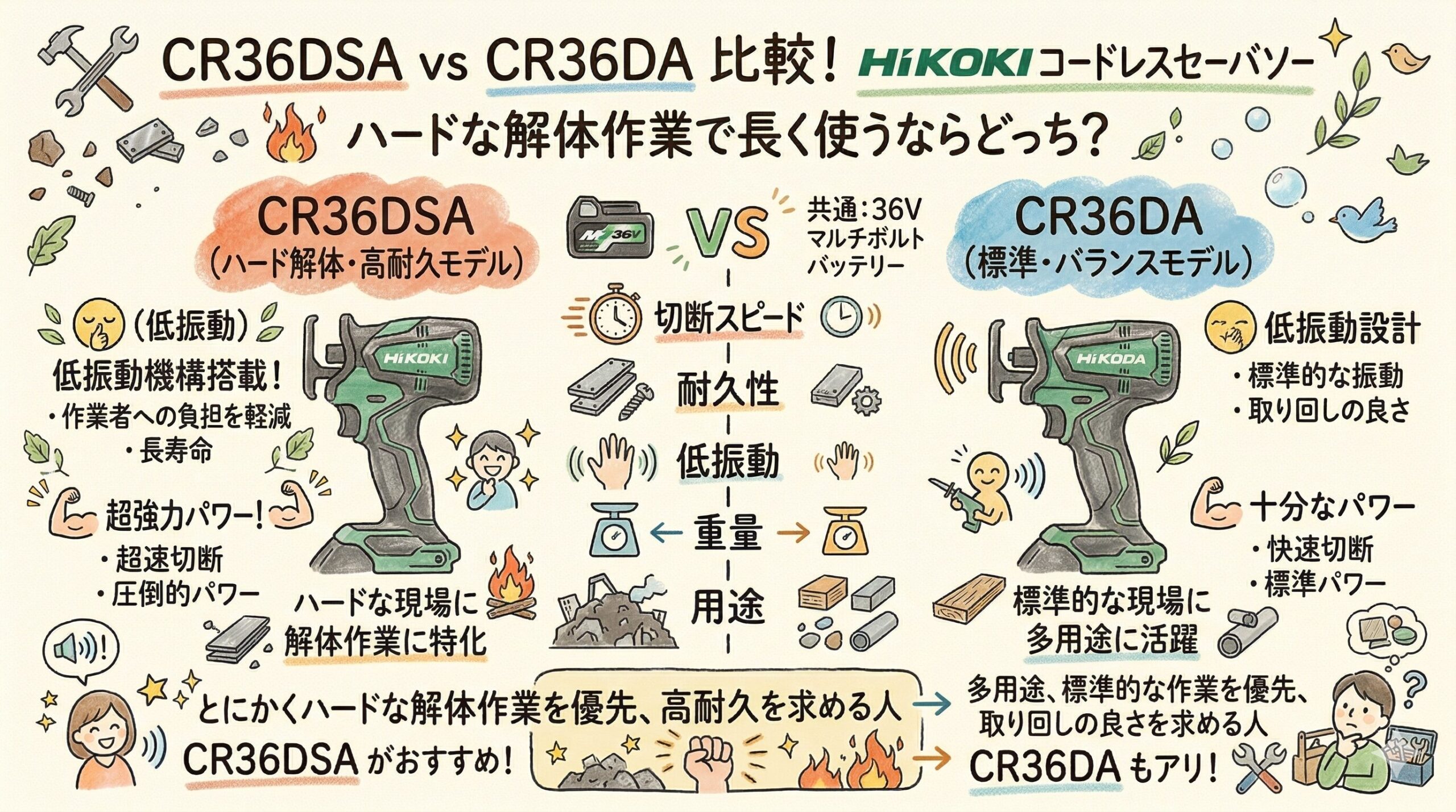 CR36DAは切断効率や高いストローク数が目を引く一方、CR36DSAは耐久性と低振動の改善が主役です。