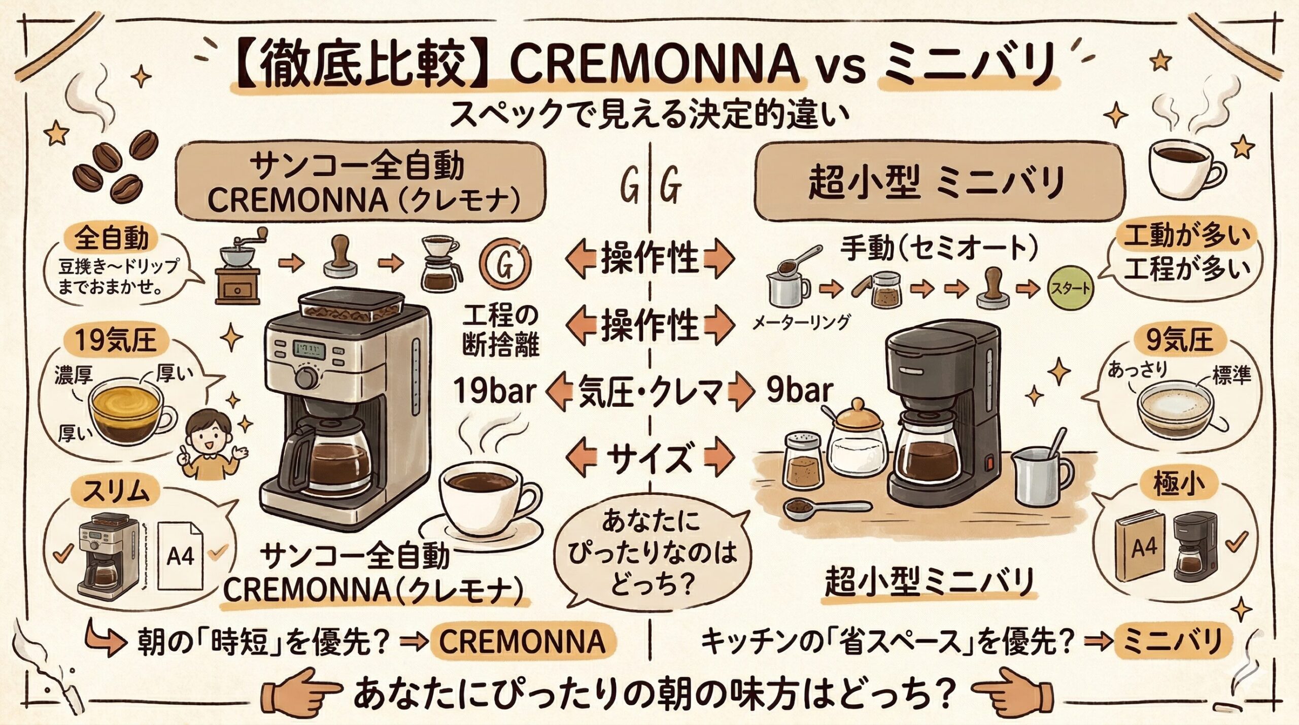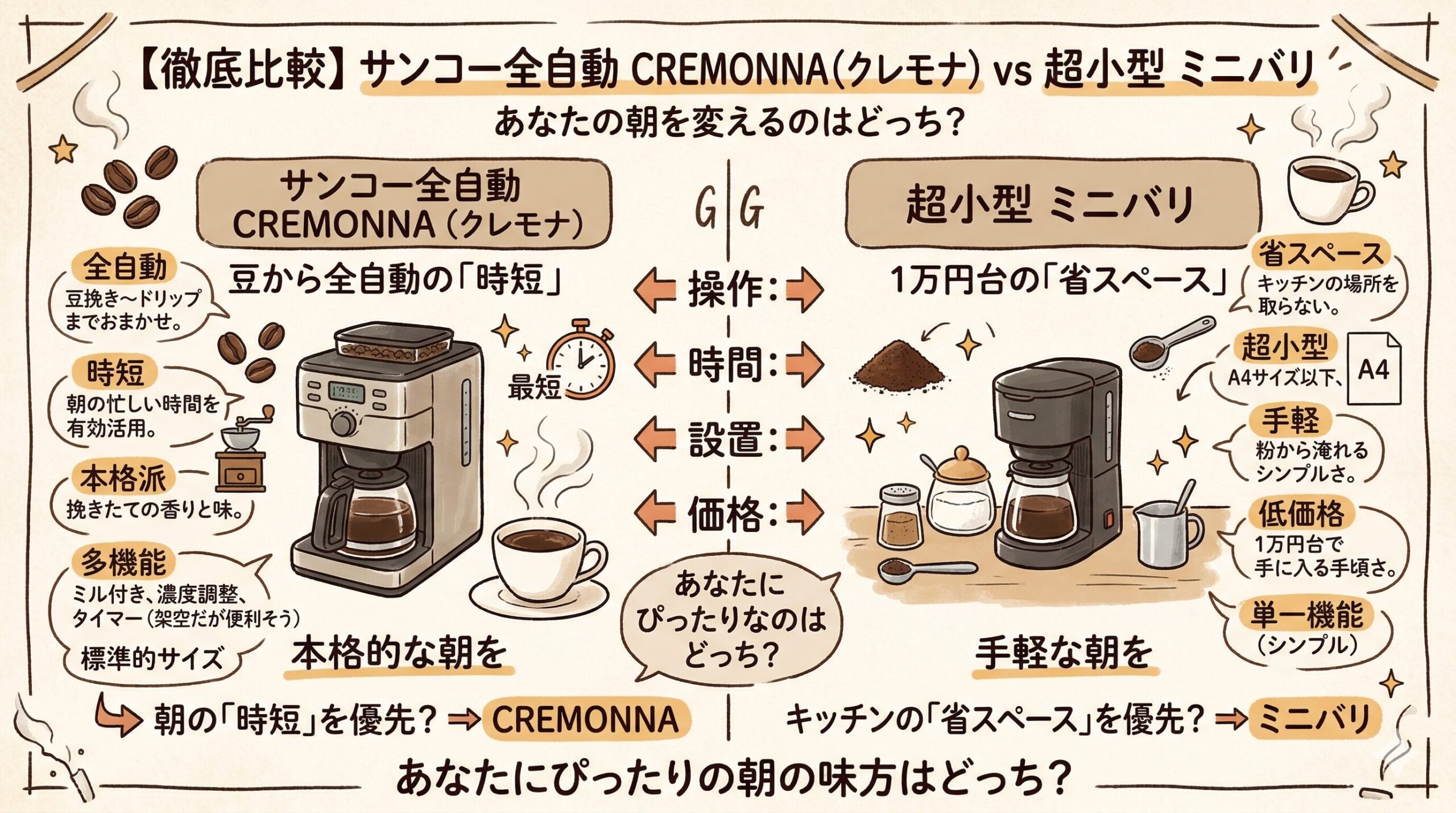 【徹底比較】サンコー全自動 CREMONNA(クレモナ) vs 超小型 ミニバリ|豆から全自動の「時短」か、1万円台の「省スペース」か?あなたの朝を変えるのはどっち?