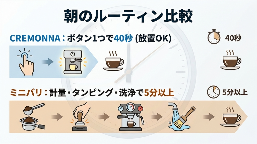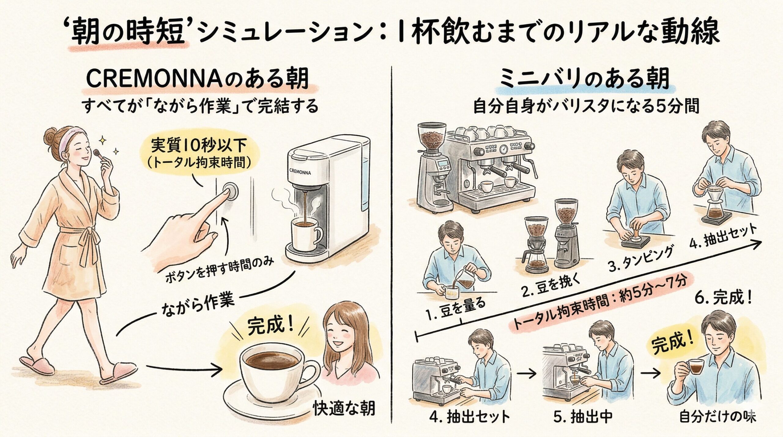準備から後片付けまで含めた「トータル拘束時間」こそが、忙しい朝のリアルです。両機種がある生活をシミュレーションしてみましょう。