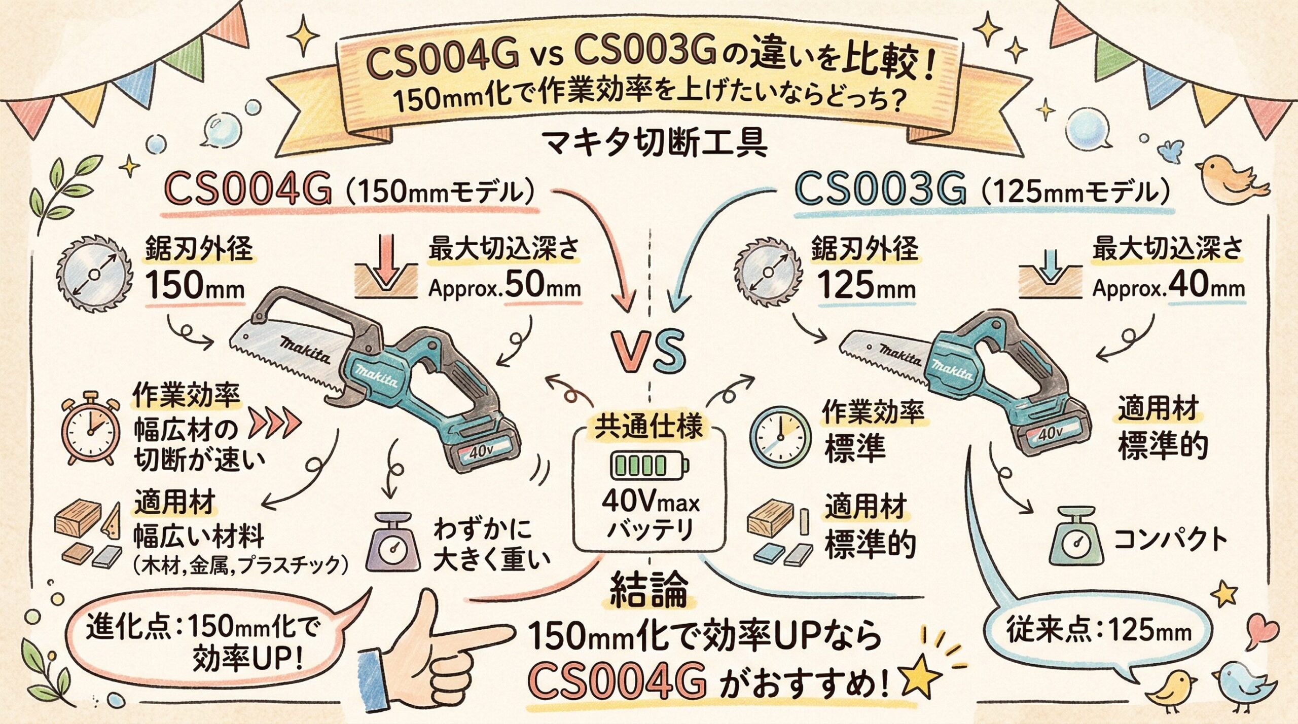 この記事では、公式情報と工具系レビューをもとに、CS004G CS003G 違い を現場目線でわかりやすく整理します。