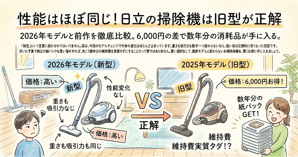 通常、モデルチェンジと言えば、「吸引力が10%アップ」や「本体が200g軽量化」といった進化のアピールがあるものです。しかし、CV-KV70Pにおいては、それらが一切ありません。これは、日立のこのクラスの掃除機がすでに「完成の域」に達していることを意味すると同時に、今回の新製品が「実質的な年次更新(型番の更新)」であることを強く示唆しています。