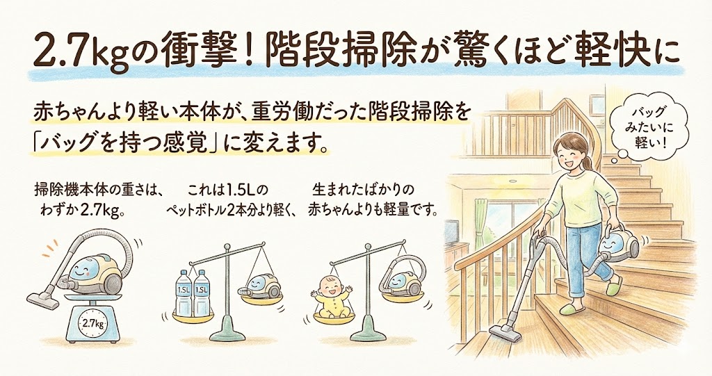2.7kgのCV-KV70なら、片手でひょいと持ち上げられます。本体のハンドル(取っ手)も持ちやすい位置に設計されており、「掃除機を持っている」というより「大きめのバッグを持っている」程度の感覚で階段を上がれます。もう片方の手でしっかりと手すりを掴む余裕が生まれるため、転倒リスクが大幅に減ります。これは単なる「楽さ」だけでなく、「安全性」を買うことにも繋がるのです。