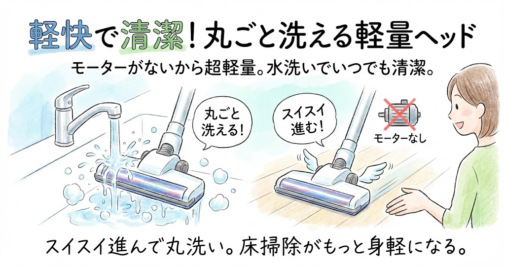 また、電気配線がないため、ヘッドを丸ごと水洗いできるという衛生面での大きなメリットがあります(モーター式は水洗い不可のパーツが多い)。