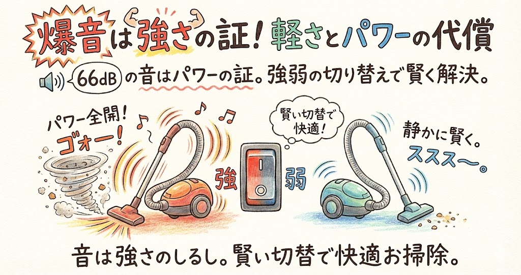 「おっ、静かになったのか!」と思われたかもしれません。しかし、音響の世界において「1dB」の差というのは、人間の耳で明確に聞き分けるのが非常に困難なレベルです。静寂な実験室で並べて聞き比べれば「気持ち、高音がマイルドになったかな?」と感じるかもしれませんが、掃除機という轟音を立てる機械において、また生活騒音のある一般家庭において、この差によって「うるさい」が「静か」に変わることはまずありません。
