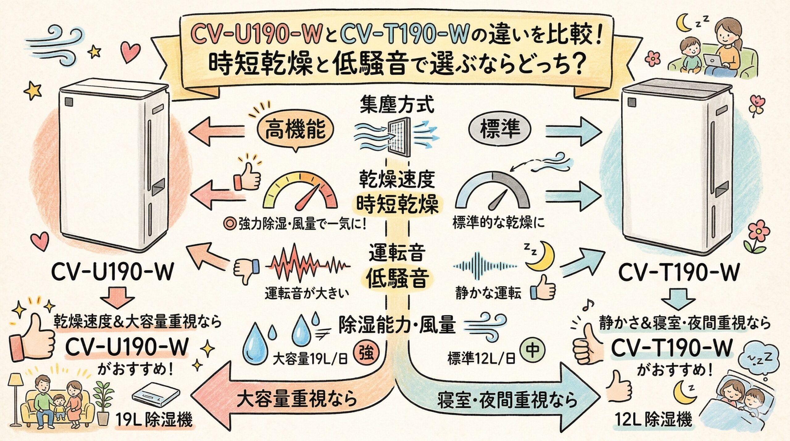 公表されている除湿能力、乾燥時間、運転音、消費電力は、CV-U190-WCV-T190-W も横並びです。