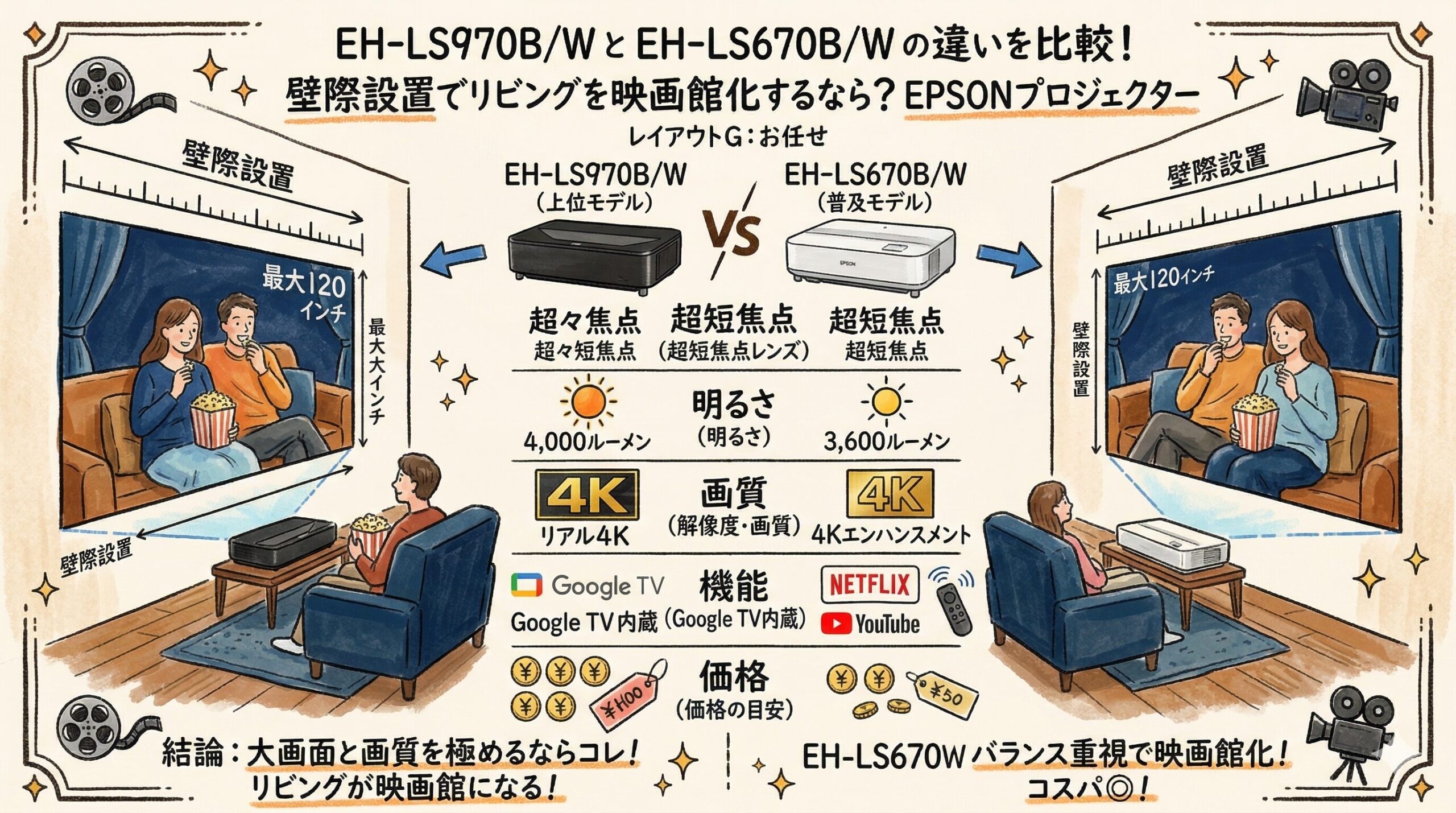EH-LS970B/W は「リビング常設の本気機」、EH-LS670B/W は「価格と満足度のバランス機」です。