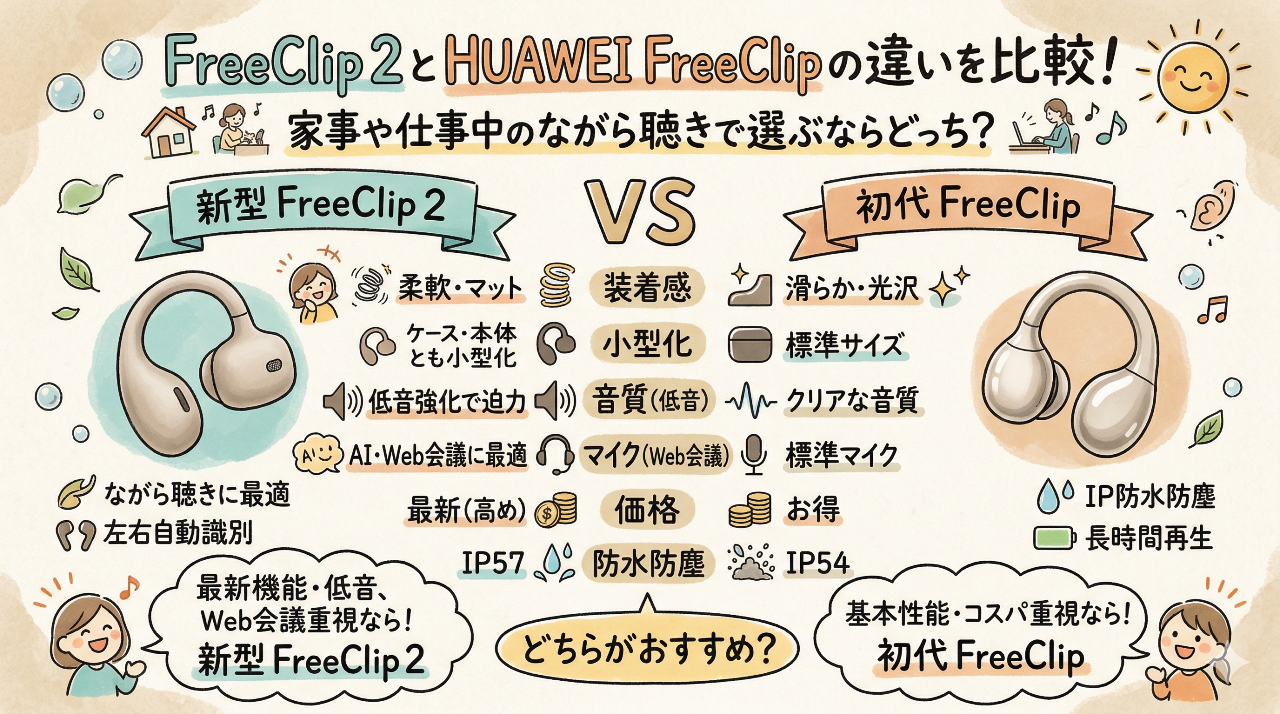 FreeClip 2とHUAWEI FreeClipの違いを比較
