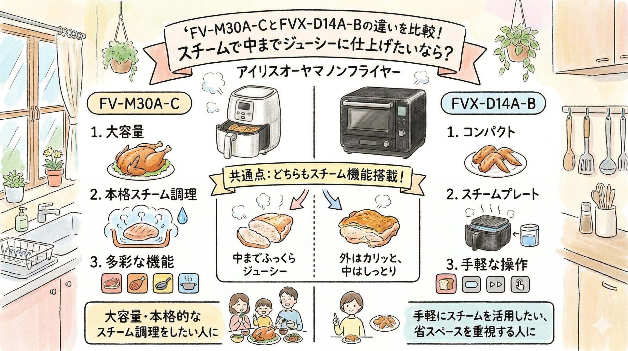 そんな人がアイリスオーヤマのノンフライヤーを見比べると、止まりやすいのが FV-M30A-C と FVX-D14A-B です。