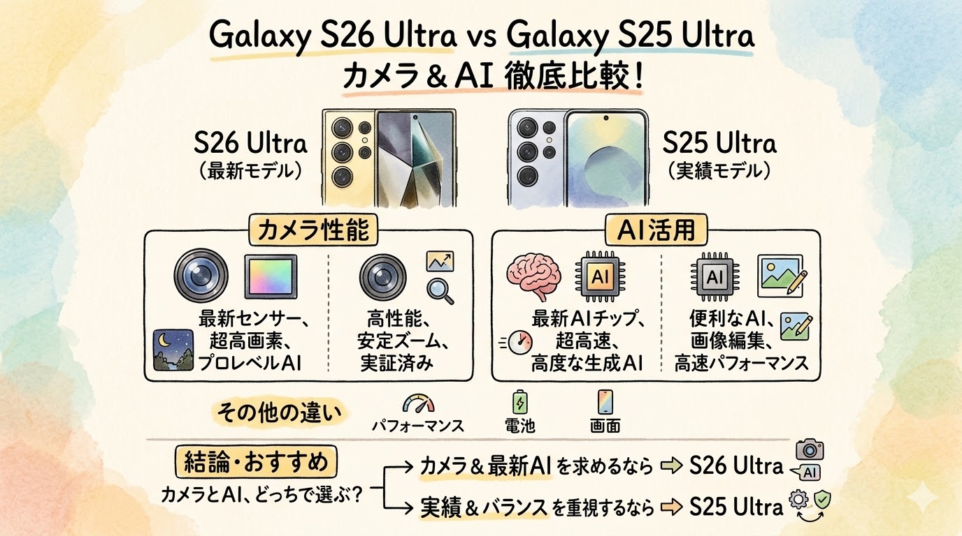 この記事では、Galaxy S26 UltraとGalaxy S25 Ultraの違いを徹底比較しながら、あなたが乗り換えるべきかどうかをズバリ判断できるように解説します。
