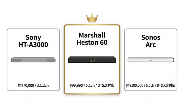 Sonyは約¥30,000安い。しかしチャンネル数はHeston 60の5.1chに対して3.1.2chと少なく、ドライバー数・出力も差がある。そして何より、Heston 60には「インテリアとして部屋に溶け込む・飾れる」という価値がある。これはSonyにはない次元の話だ。¥30,000のコスト差を「デザインの価値」でどう評価するかが分かれ目になる。