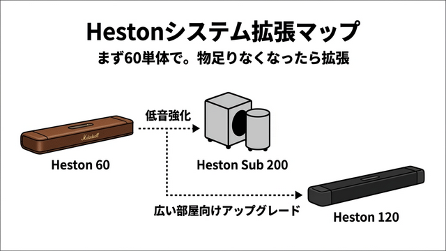 Marshall公式サポートでは、Heston 60と外部サブウーファーの接続が案内されている。Hestonシリーズ専用のHeston Sub 200を追加すれば、低音の迫力を大幅に強化できる。映画のアクションシーン、ライブ音楽の胴体に響く低音——それを求めるなら、後からSub 200を追加するのが最もシステマティックな拡張方法だ。