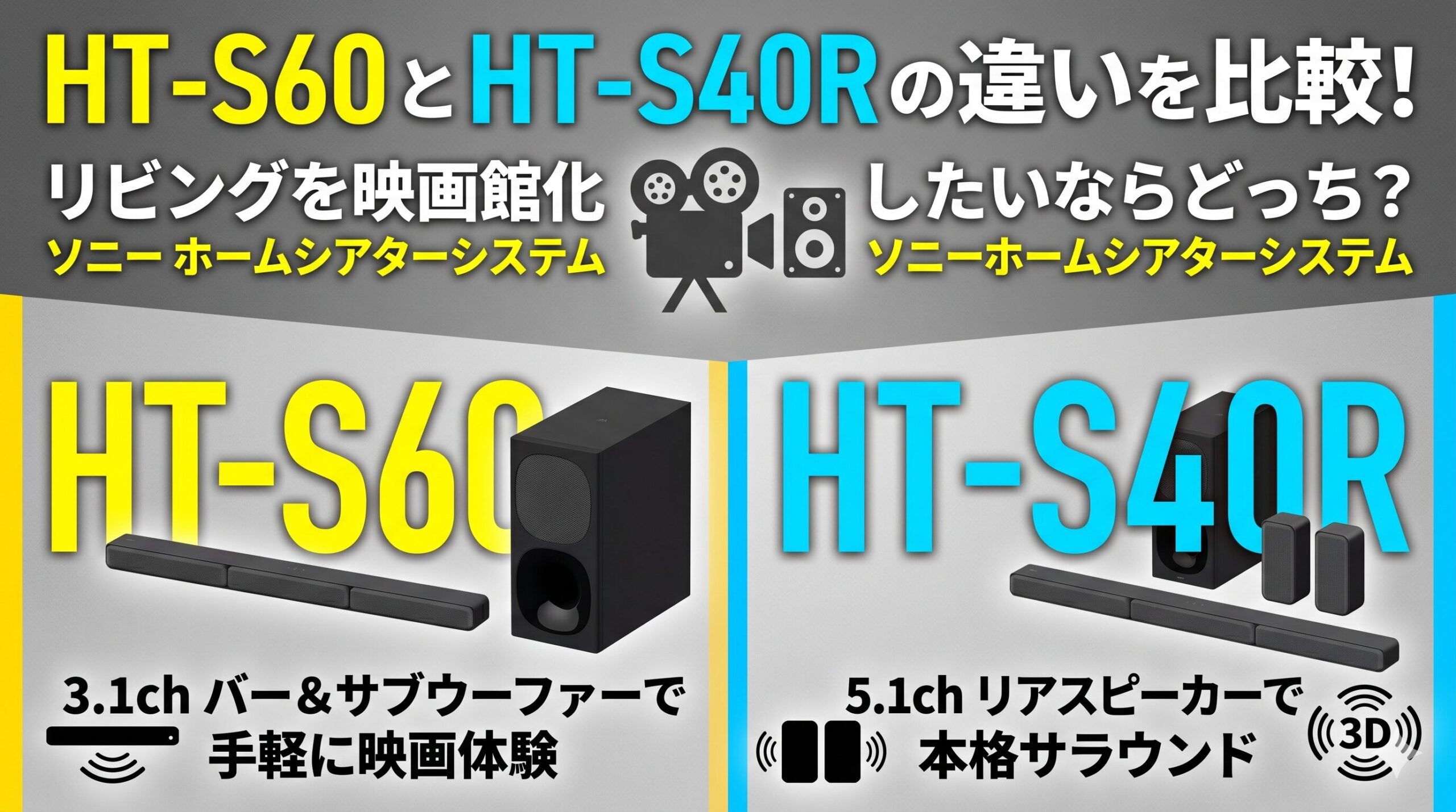 結論からいうと、映画・ライブ・スポーツを今の配信環境でしっかり楽しむならHT-S60、価格重視でリアル5.1chを安く始めたいならHT-S40R です。