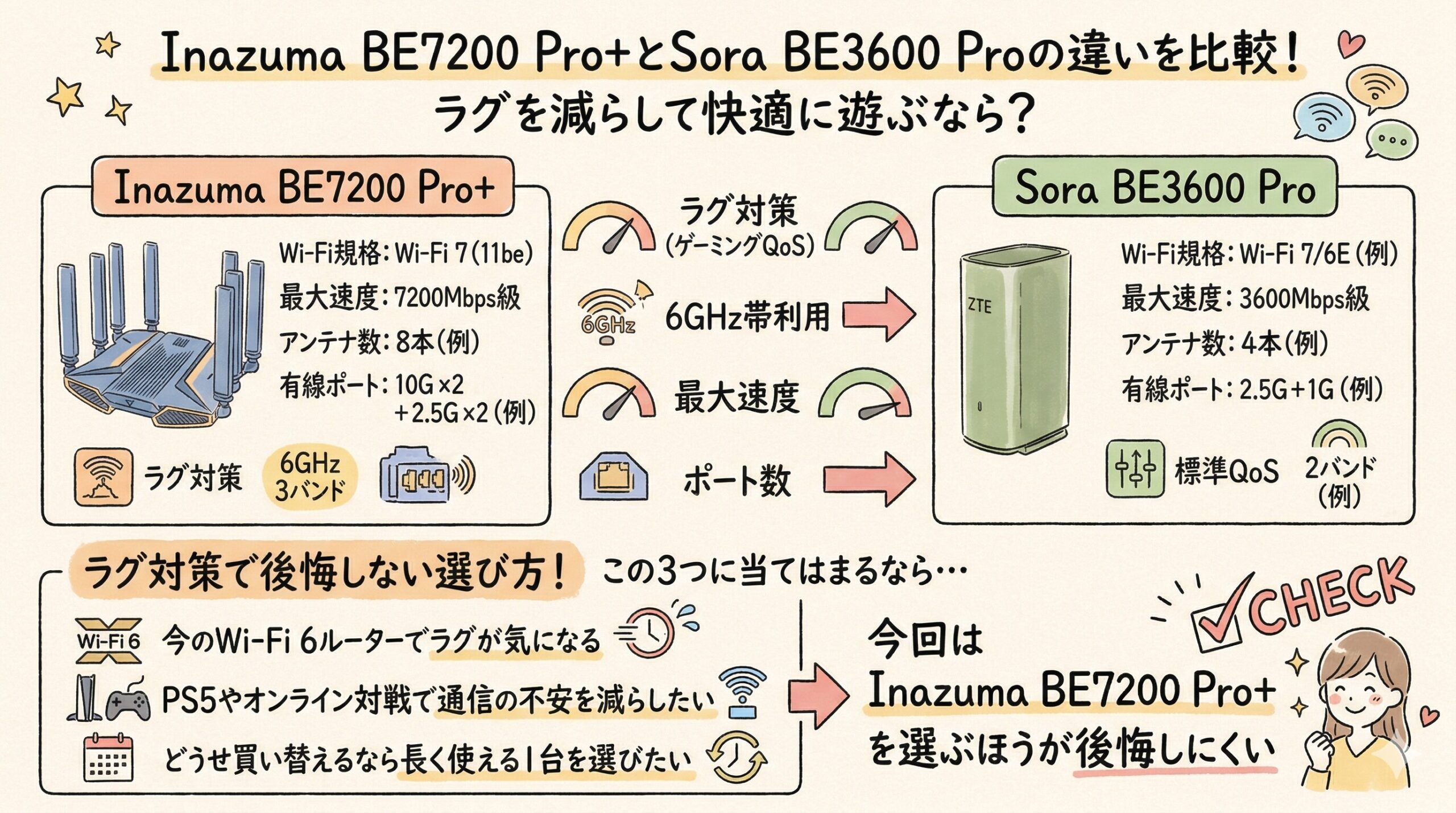 この記事では、Inazuma BE7200 Pro+ と Sora BE3600 Pro の違いを、スペック表の数字だけでなく、PS5やオンライン対戦でどう効くのかまで噛み砕いて整理します。