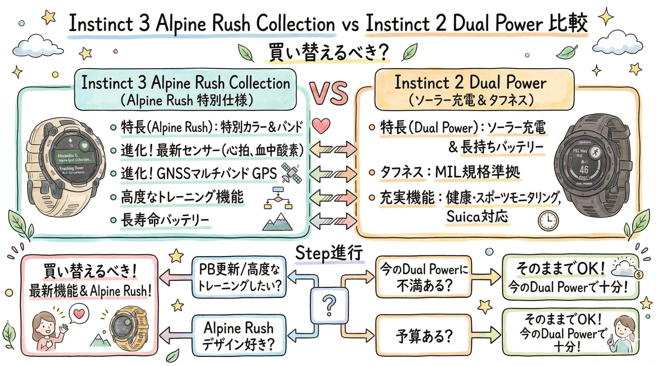 Instinct 2 Dual Power を使っていて、電池や耐久性に満足しているなら急ぎの買い替えは不要です。