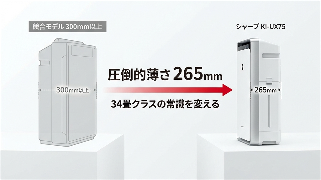 KI-UX75は、「34畳対応」という圧倒的なパワーを持ちながら、「奥行き265mm」という驚異的な薄さでリビングに溶け込みます。