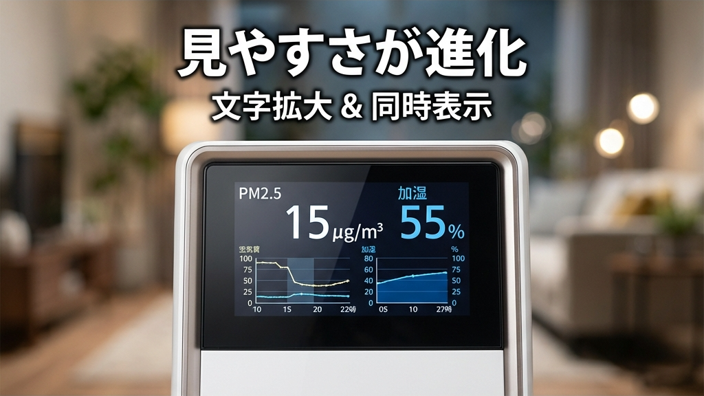 「今は湿度が低いから加湿を強めようかな」「PM2.5が高いから換気は控えよう」といった判断が、画面を一瞥するだけで可能になります。 - 文字サイズ拡大モードの搭載