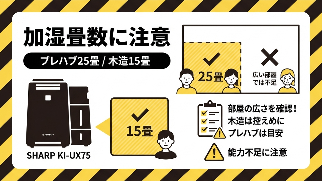 「木造で20畳以上」の広い空間を加湿したい場合は、素直に専用の大型加湿器を併用するか、さらに上のクラス(KI-UX100など)を検討する必要があります。