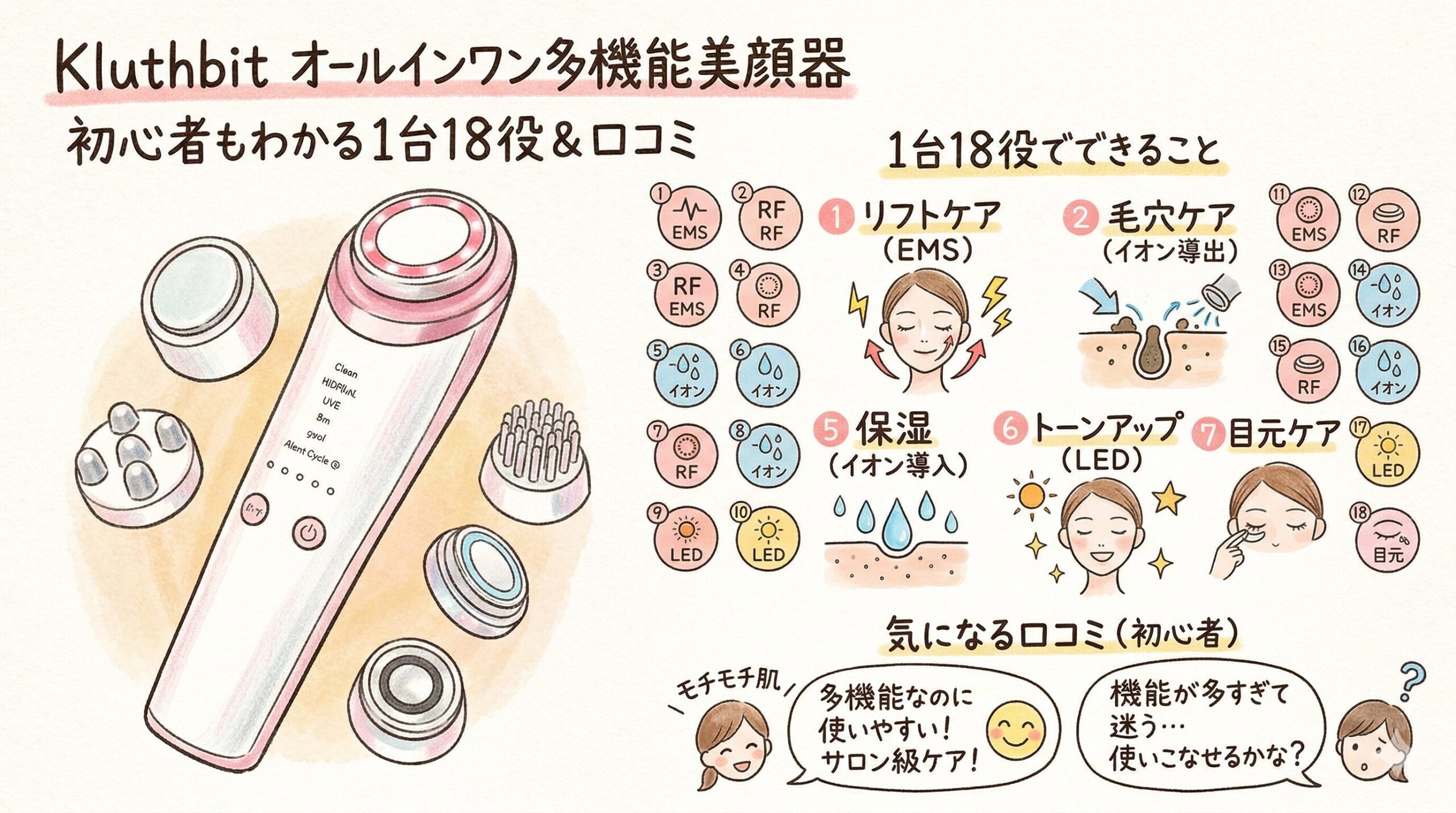 この記事では、Kluthbit オールインワン多機能美顔器の口コミ傾向、できること、向いている人、注意点を初心者向けに整理していきます。