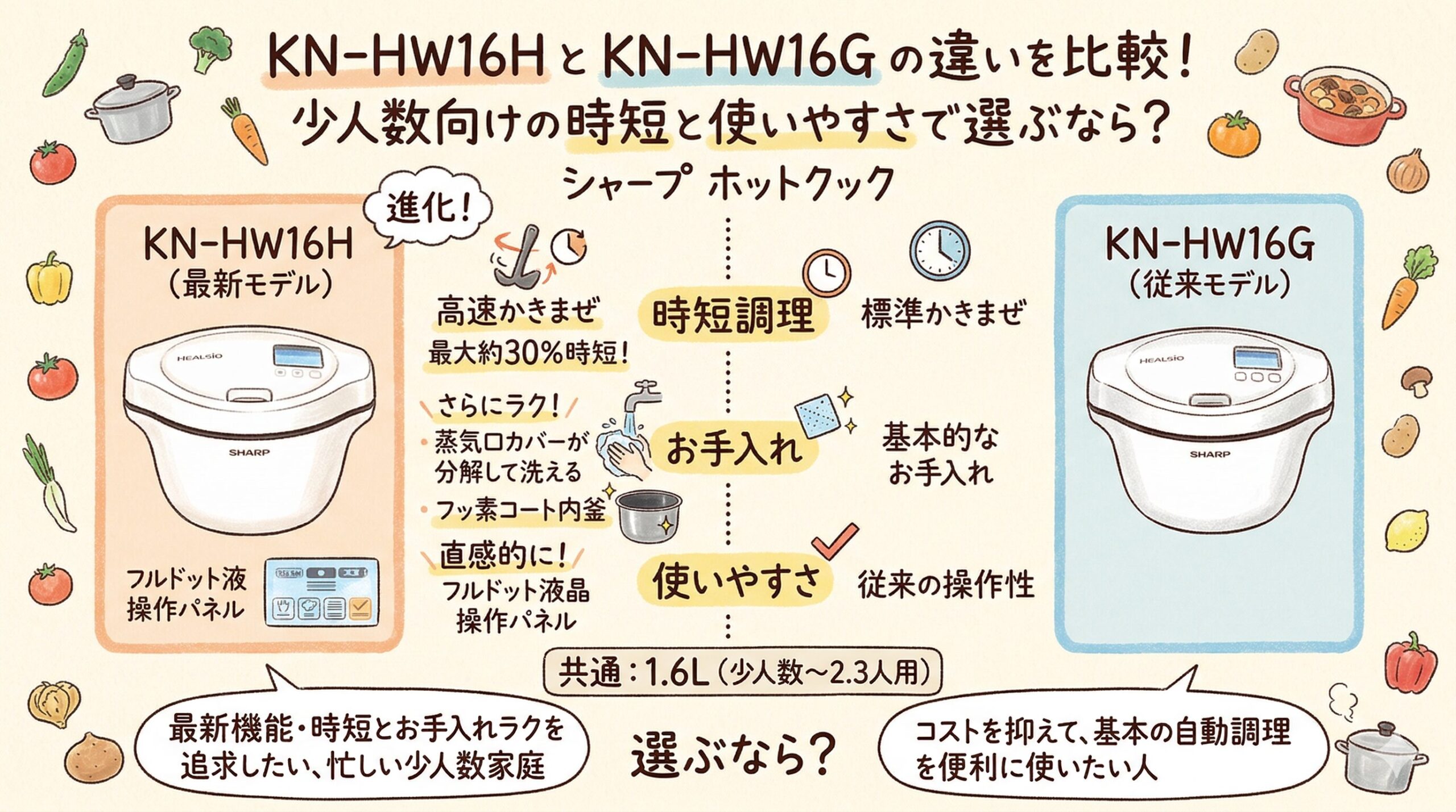 安さ重視なら KN-HW16G もまだ魅力はありますが、時短、炊飯、お手入れの差は、使うほどじわじわ効いてきます。