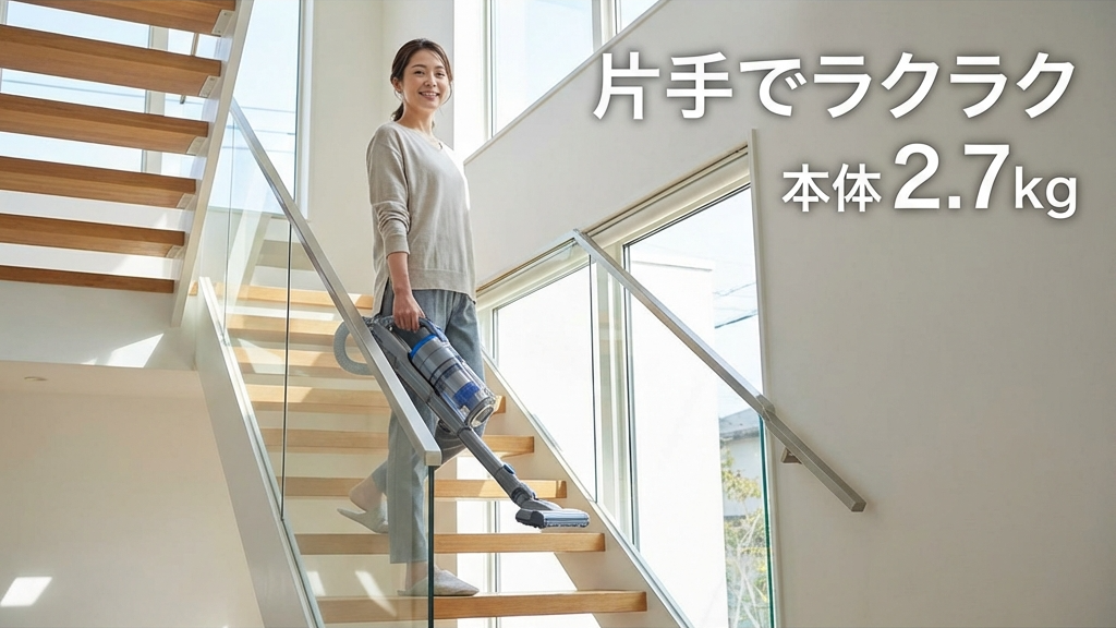 しかし、PJシリーズの2.7kgなら、片手でひょいと持ち上げられます。「掃除機を持って階段を上がる」という動作のハードルが劇的に下がります。
