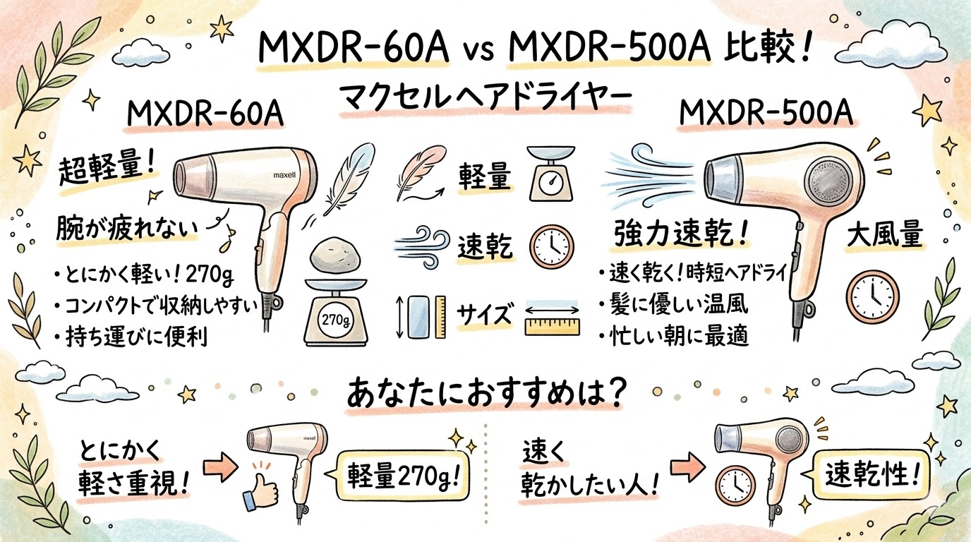 特に「軽いドライヤーが欲しい」「毎日使うから腕が疲れたくない」「家族みんなで使いたい」という人には、MXDR-60Aの270gという軽さが決定的な差になります。