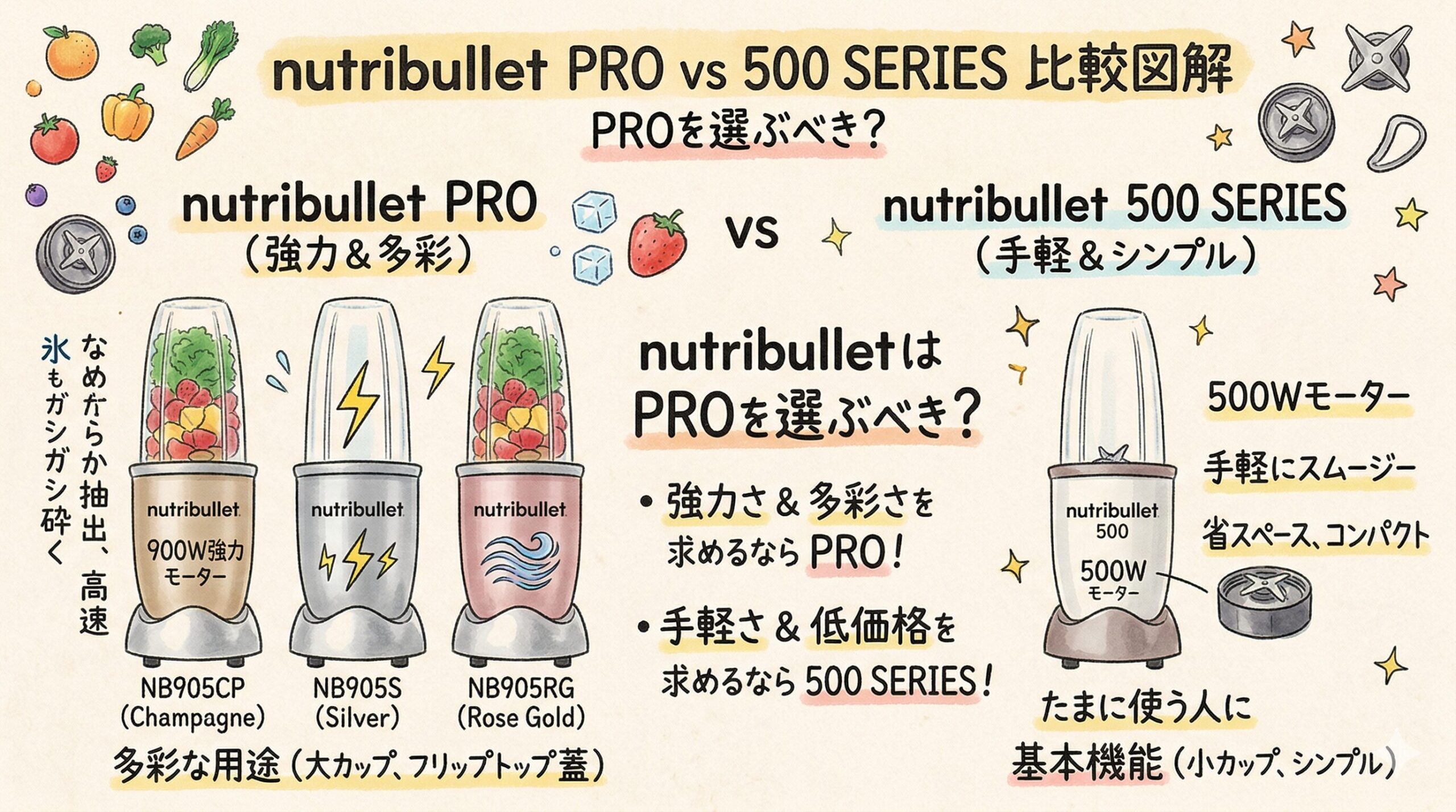 NB905CP・NB905S・NB905RGと500 SERIESの違いを比較。nutribulletはPROを選ぶべき?