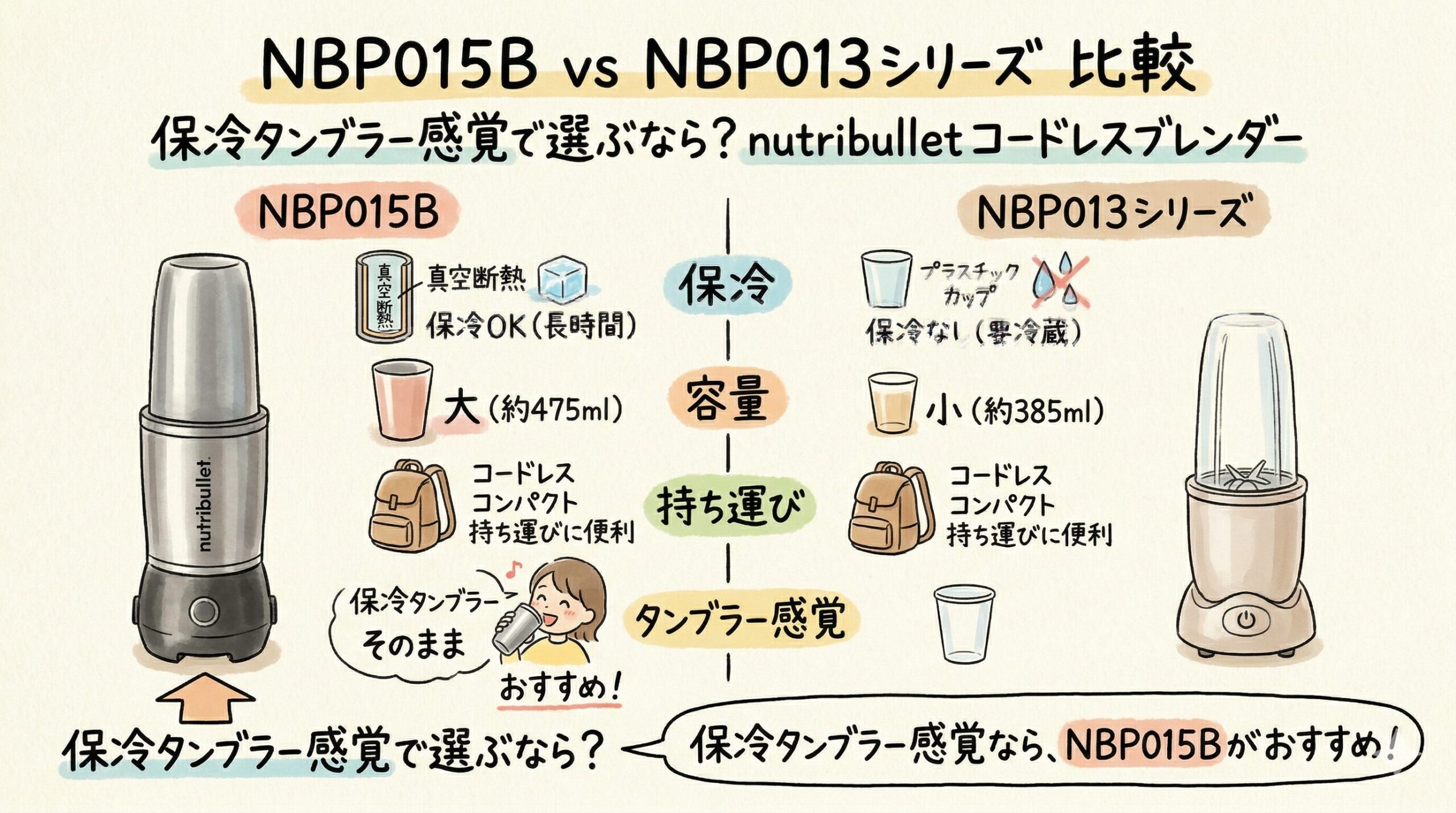 NBP015BとNBP013シリーズの違いを比較!保冷タンブラー感覚で選ぶなら?nutribulletコードレスブレンダー