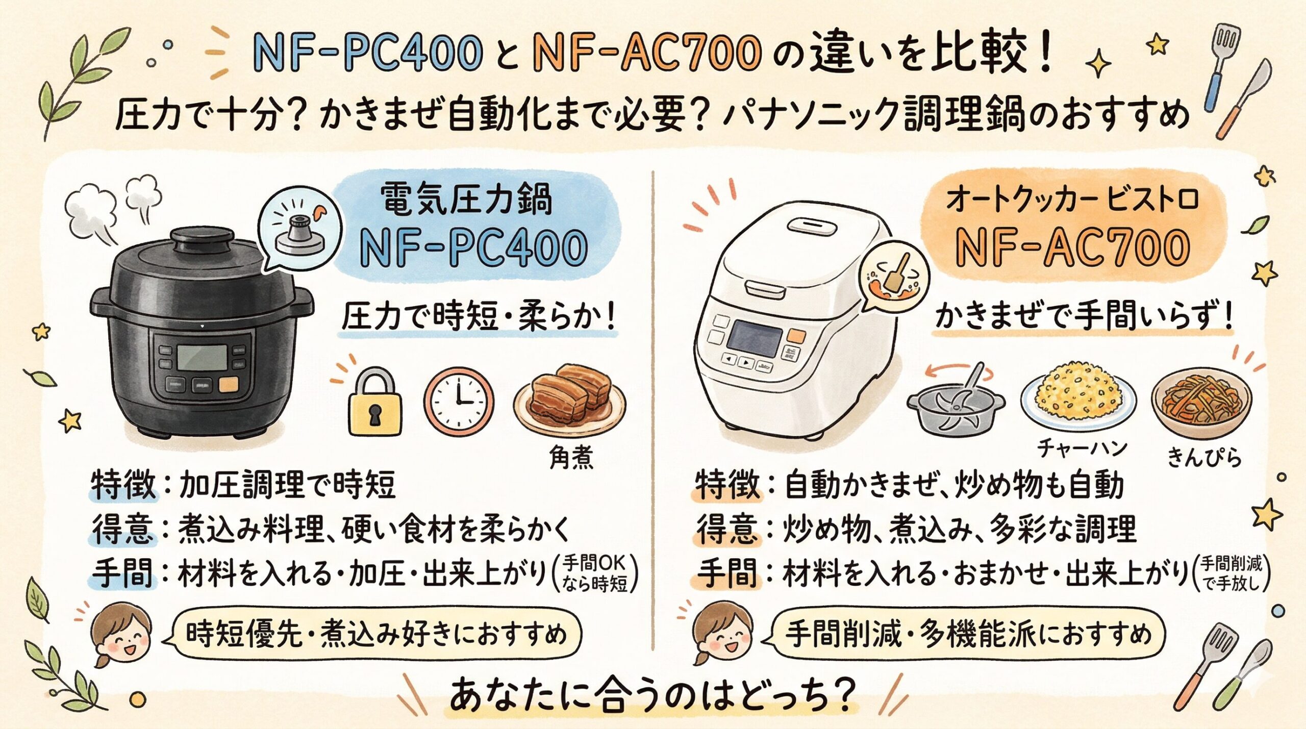 圧力で煮込みをラクにしたいなら NF-PC400。炒め・かきまぜ・パスタまで鍋仕事ごと任せたいなら NF-AC700