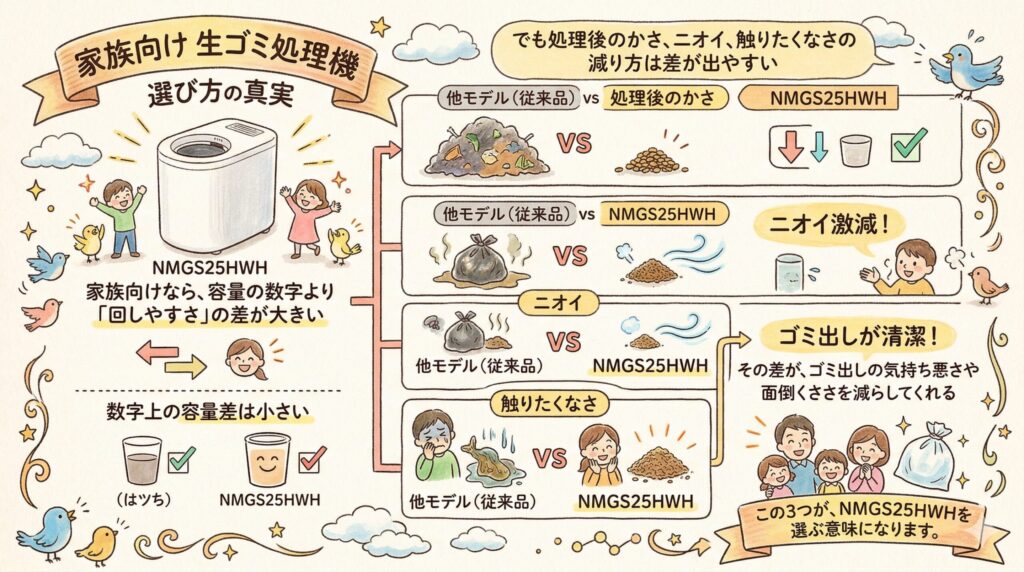 • 家族の生ゴミ量が多く、ゴミ出し回数やニオイのストレスをまとめて減らしたいなら NMGS25HWH