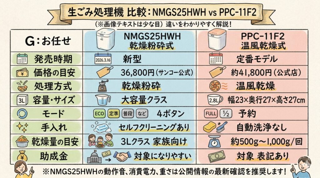 NMGS25HWHとPPC-11F2の違いを比較!家族向けの生ゴミ処理機はどっち?