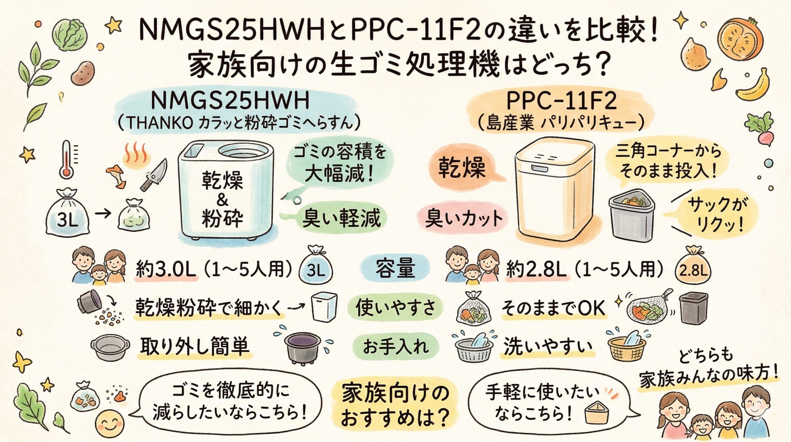 NMGS25HWHとPPC-11F2の違いを比較!家族向けの生ゴミ処理機はどっち?
