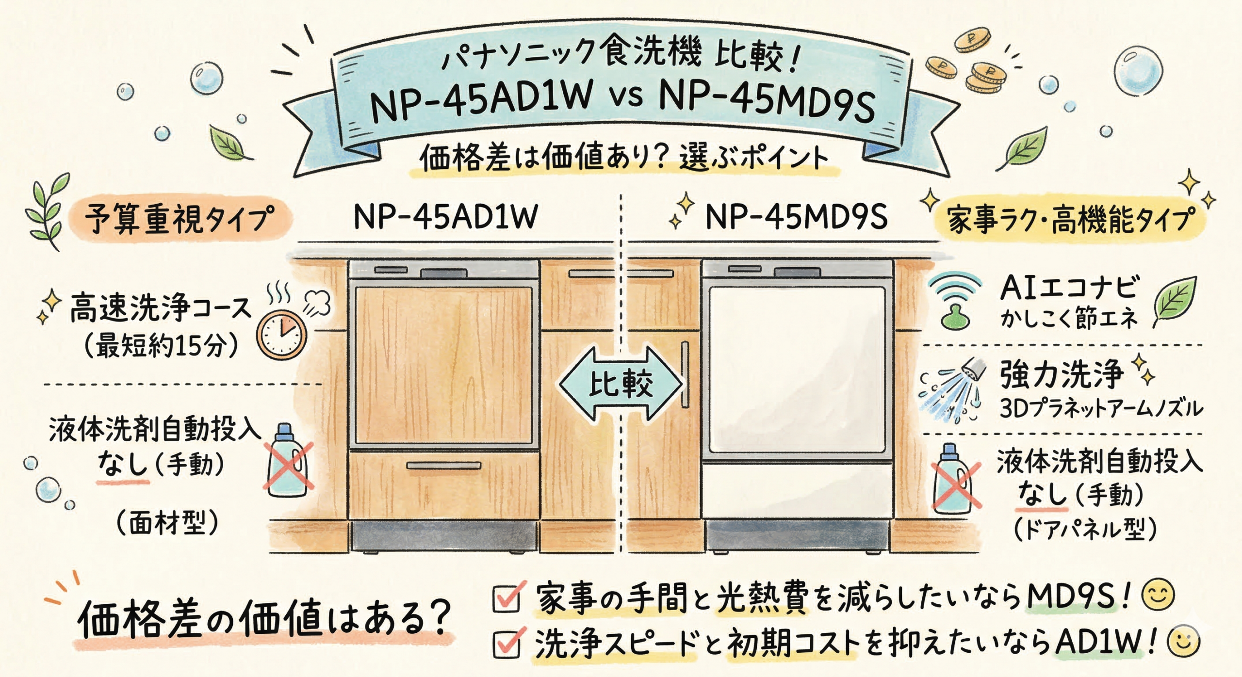 NP-45AD1WとNP-45MD9Sの違いを比較!価格差は価値あり?高速洗浄と液体洗剤自動投入で選ぶパナソニック食洗機